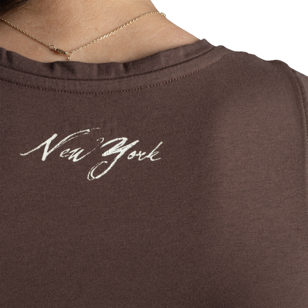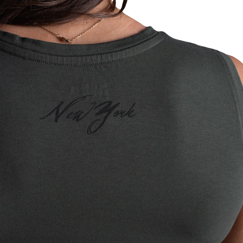 NYタンクトップは柔らかく伸縮性のある素材を使用したウエスト丈のタンクトップです。ミニマルなデザインとプリントはレギンスやジーンズと合わせて夜のお出かけに活躍します。