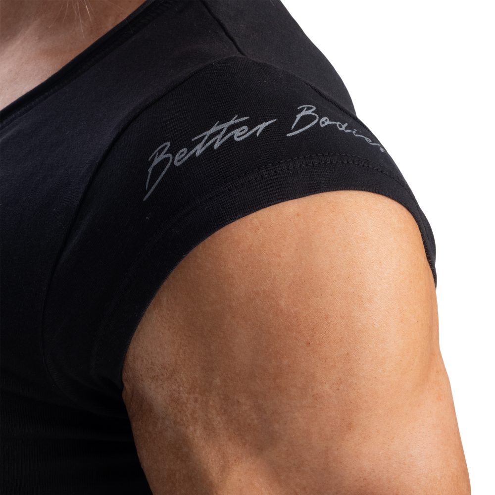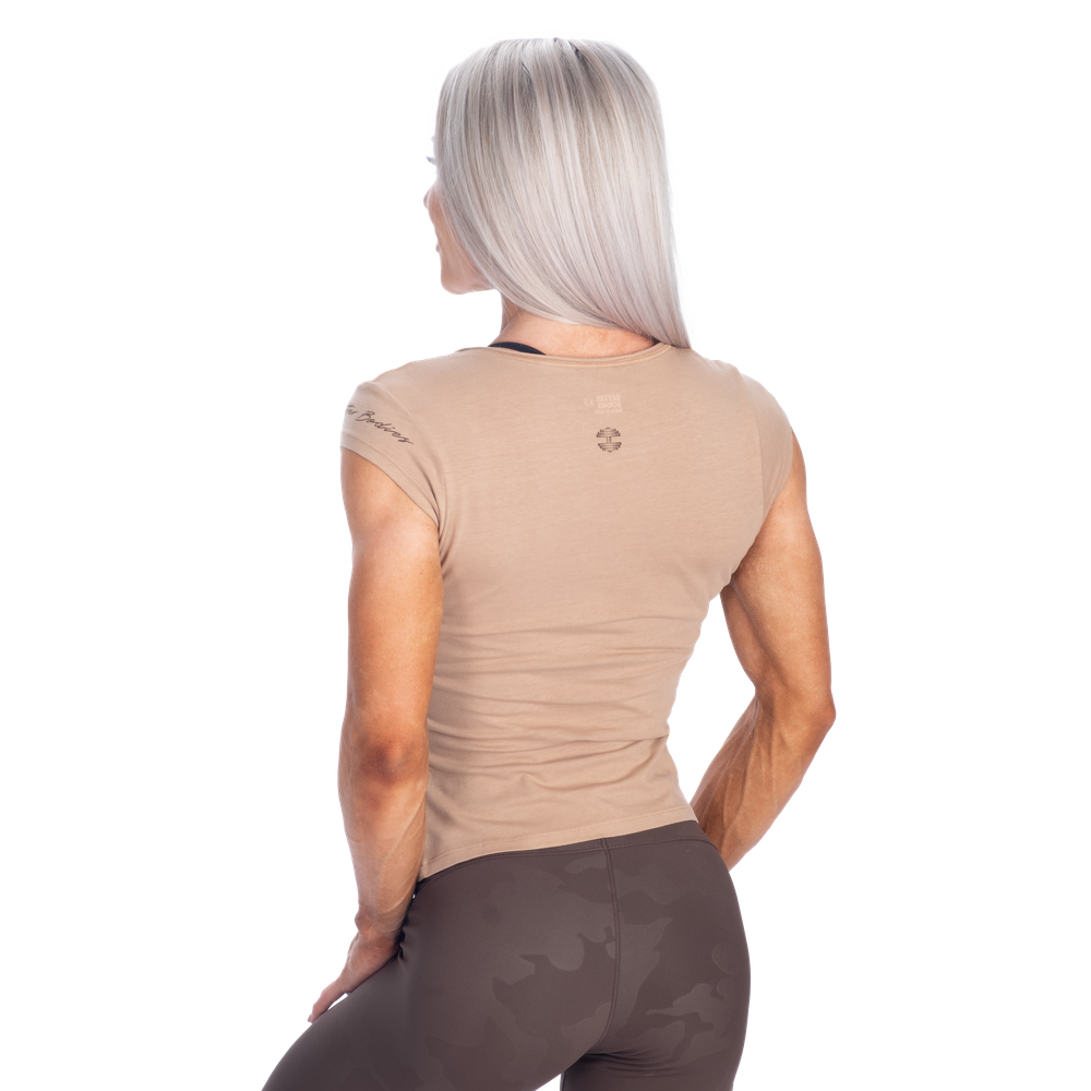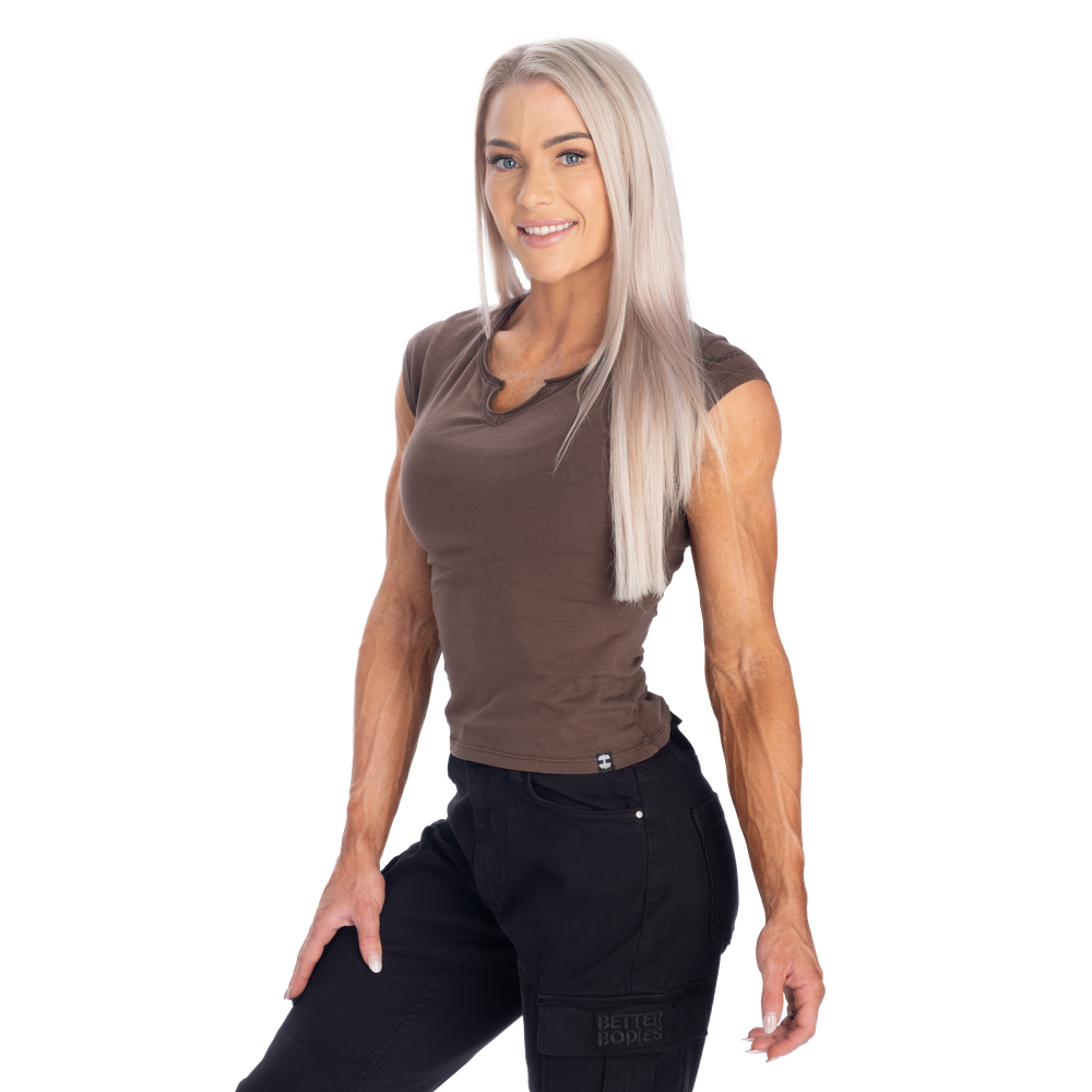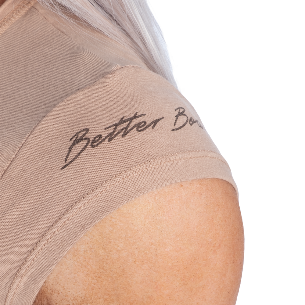 スリムフィットとセミクロップド丈で毎日のスタイルを美しく演出します。ネックラインの小さなV字ディテールとキャップスリーブが個性をプラス。袖のさりげないプリントがベターボディーズのアティチュード自信に満ち、力強く、ありのままの自分を表現しています。