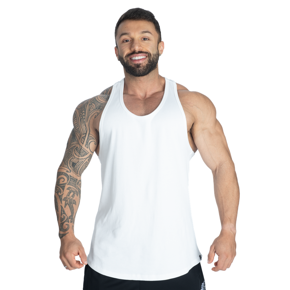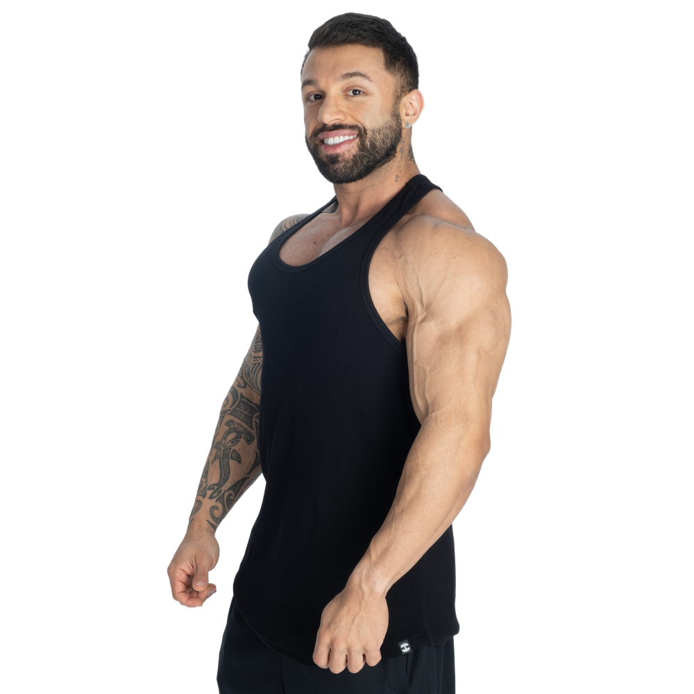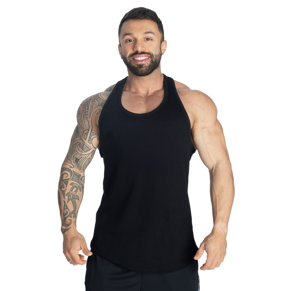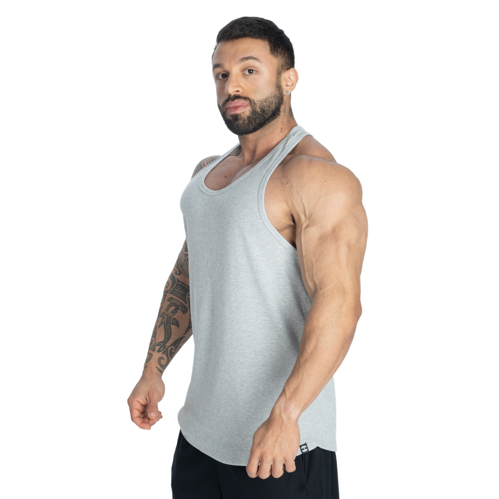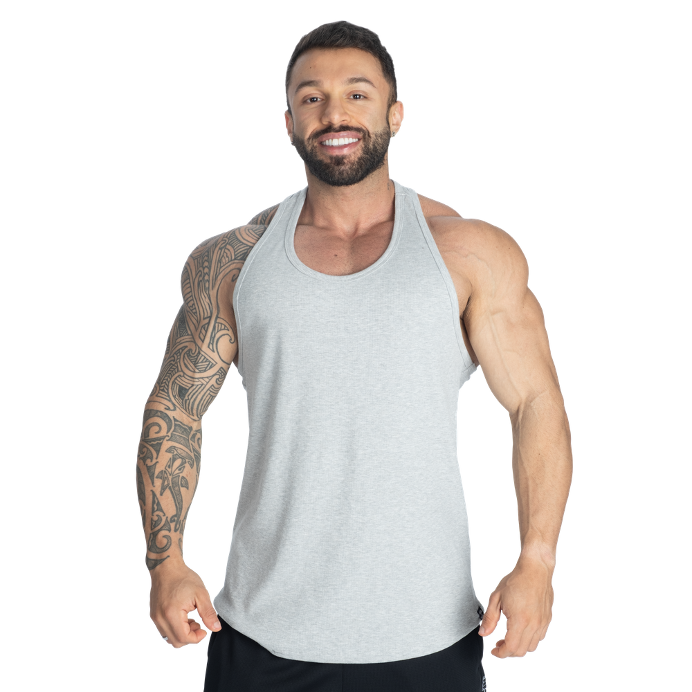 このソフトなレギュラーフィットのTバックタンクトップはラウンドヘムで非常に柔らかなリブ素材を使用しています。