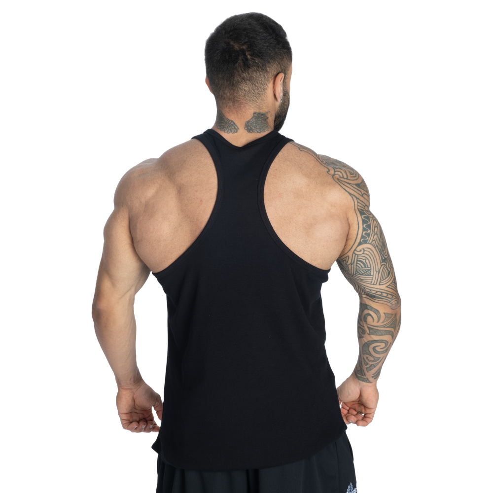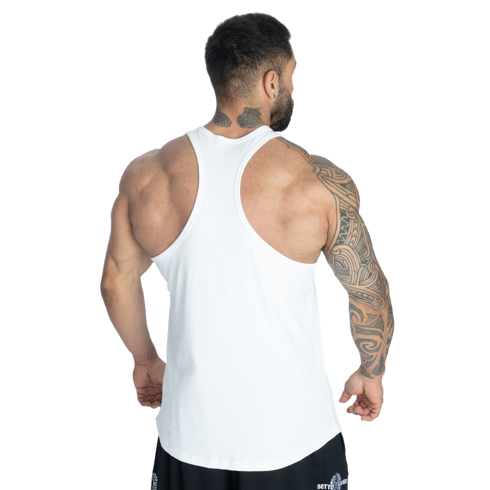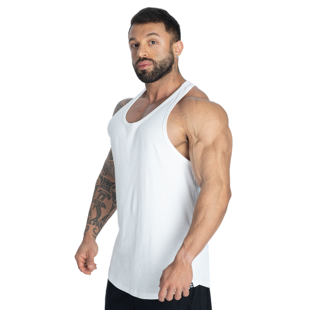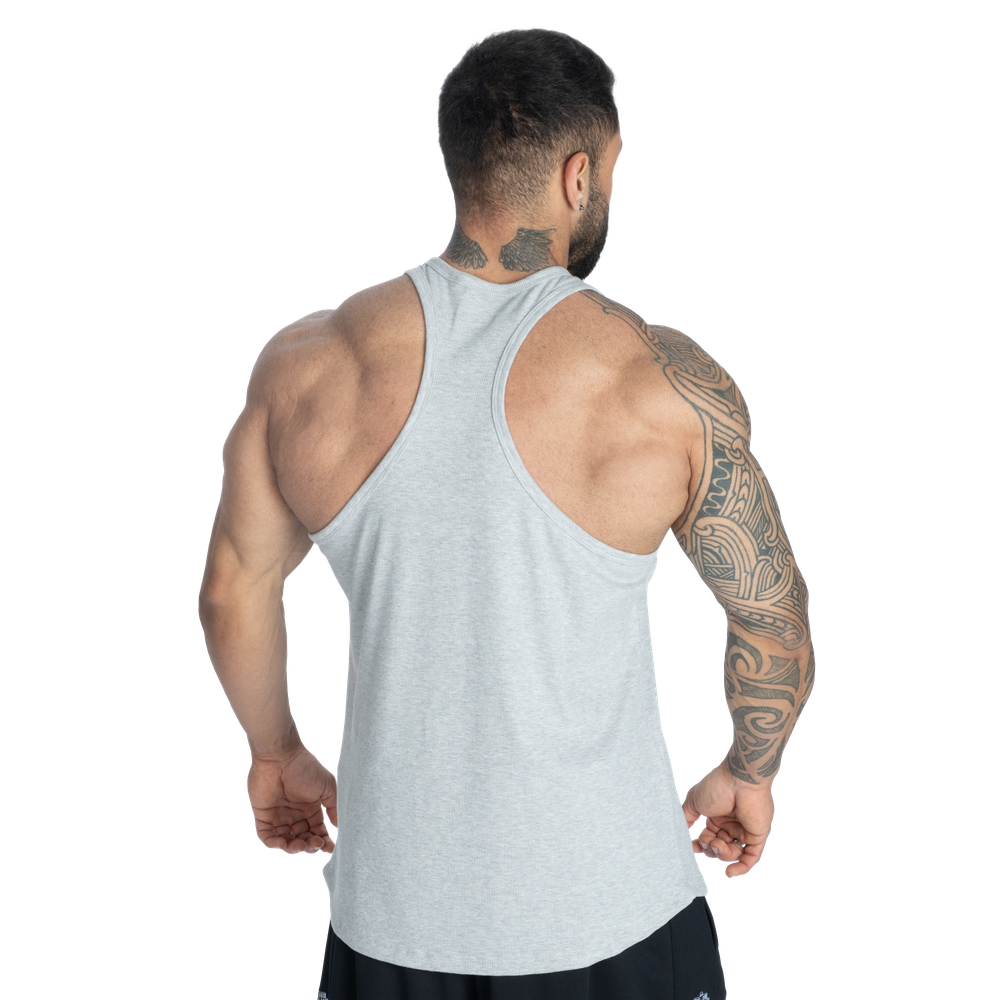 このソフトなレギュラーフィットのTバックタンクトップはラウンドヘムで非常に柔らかなリブ素材を使用しています。