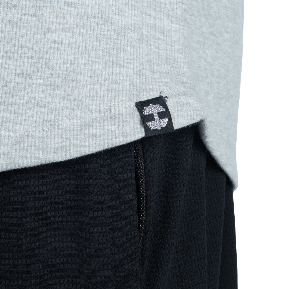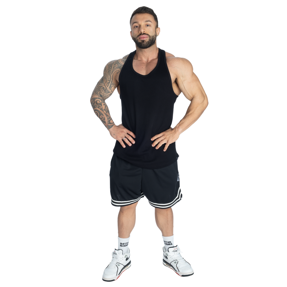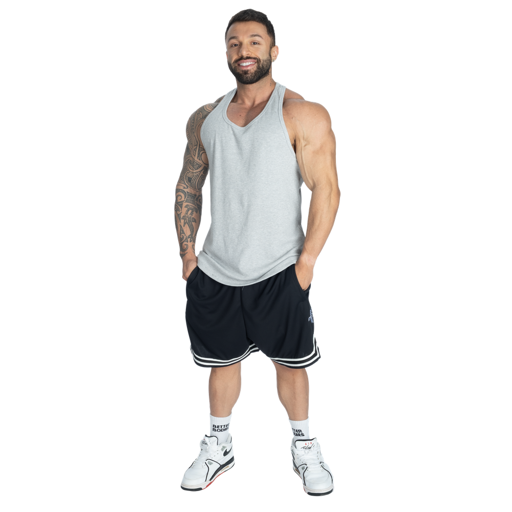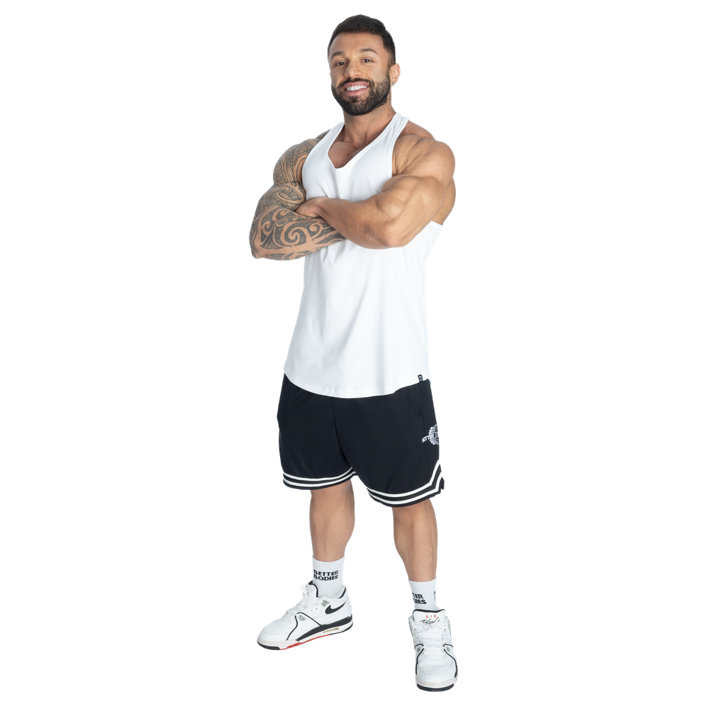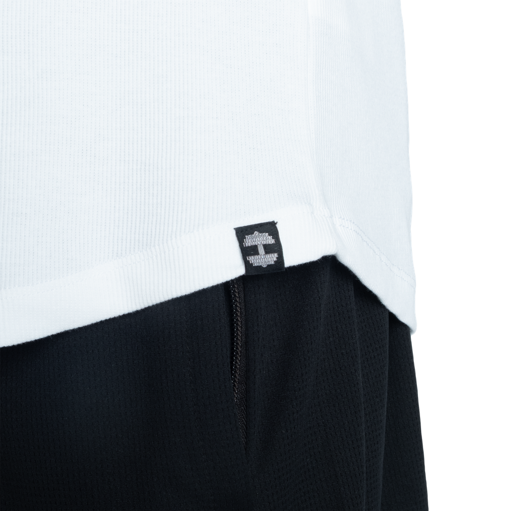 このソフトなレギュラーフィットのTバックタンクトップはラウンドヘムで非常に柔らかなリブ素材を使用しています。