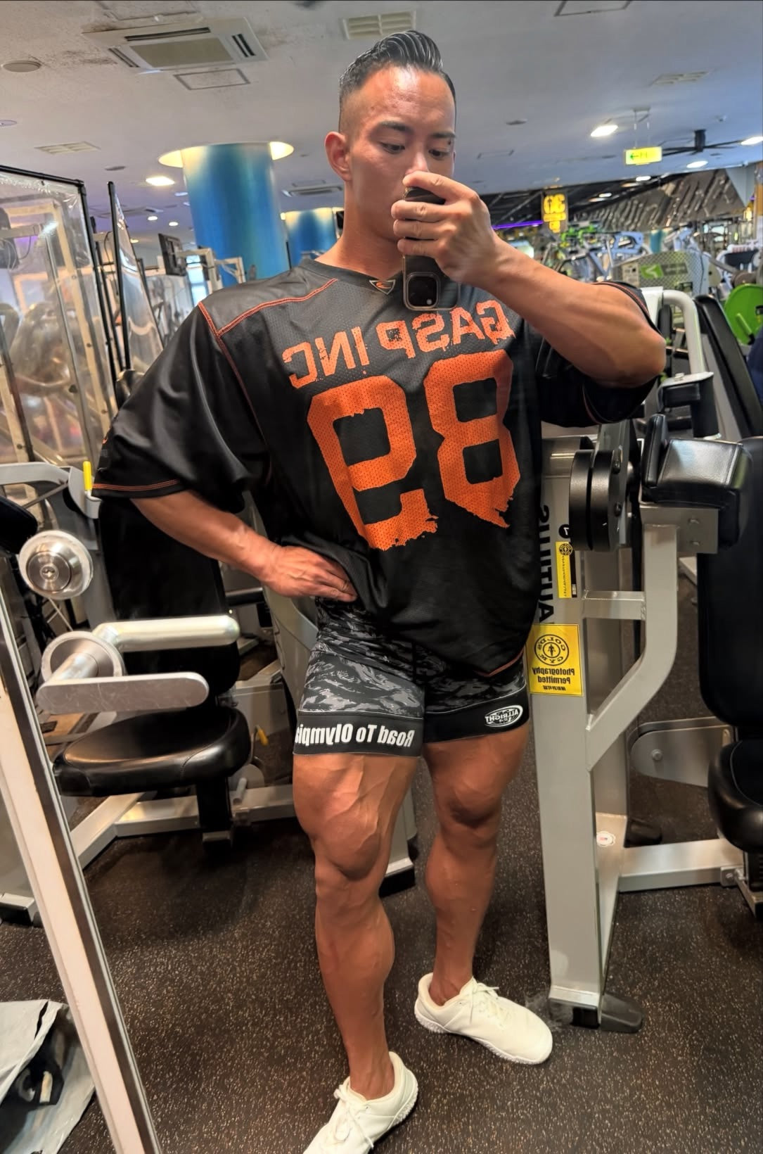 ブラック/フレイム、レッドを着用している高田晃志選手 koji_takada0223 (FWJ 2020 ジェネレーションクラシック ボディビル優勝 他優勝入賞多数)は身長180cm、体重105kgでXXLサイズを着用しています。