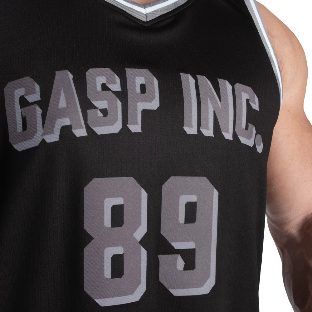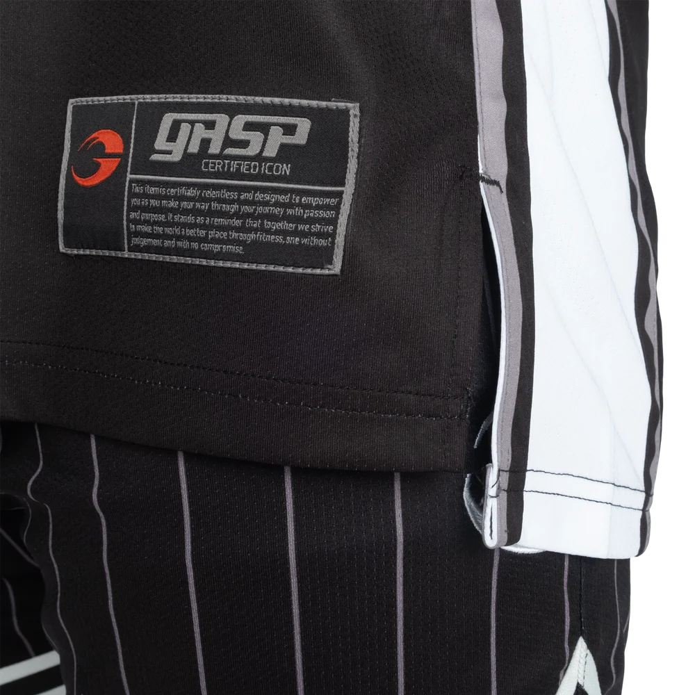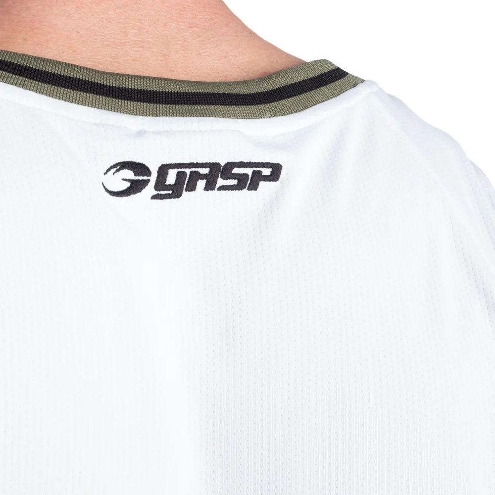 優れた通気性を誇るマイクロメッシュ素材を使用。サイドパネル、フロントとバックに大きなGASP 89ロゴ、ネック中央のGASP刺繍、バック裾の「No Excuses」プリント、裾の織りラベルが特徴です。